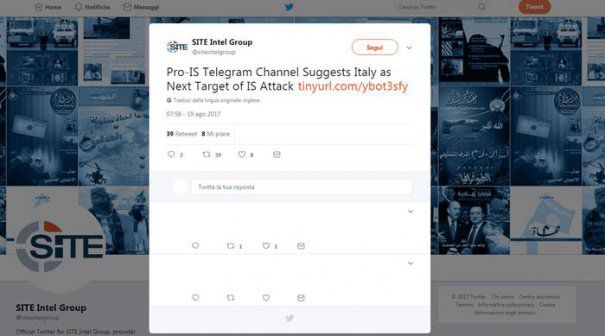 ISIS, prin intermediul unui canal Telegram apropiat Statului Islamic, incită „lupii singuratici” ai jihadului să atace Italia, folosind ca armă vehicole. Această referire o face siteul SUA de monitorizare al extremismului islamic pe web direct de la Rita Katz. „Trebuie să-i combateţi” (O Muwahhid), este scris în italiană într-o imagine în care este înfăţişat un bărbat care ascunde la spate un cuţit, pe fundalul imaginii unui oraş.