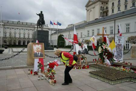 Fratele geamăn al președintelui defunct, Jaroslaw Kaczynski, liderul principalului partid de opoziție Dreptate și Justiție (PiS, conservator), a depus o coroană de flori și a aprins lumânări în fața unei mari cruci formate din candele aprinse, în fața palatului prezidențial din centrul Varșoviei.