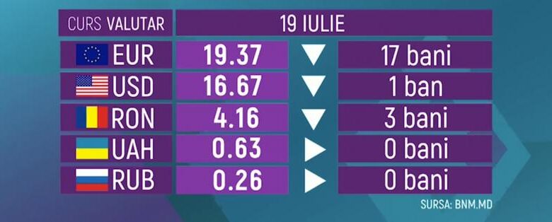 Banca Naţională a stabilit pentru astăzi, 19 iulie, un curs oficial de 19 lei şi 37 de bani pentru un euro, cu 17 bani mai puţin decât ieri. Cotația dolarului american a scăzut cu un ban şi are un preţ oficial de 16 lei şi 67 de bani.