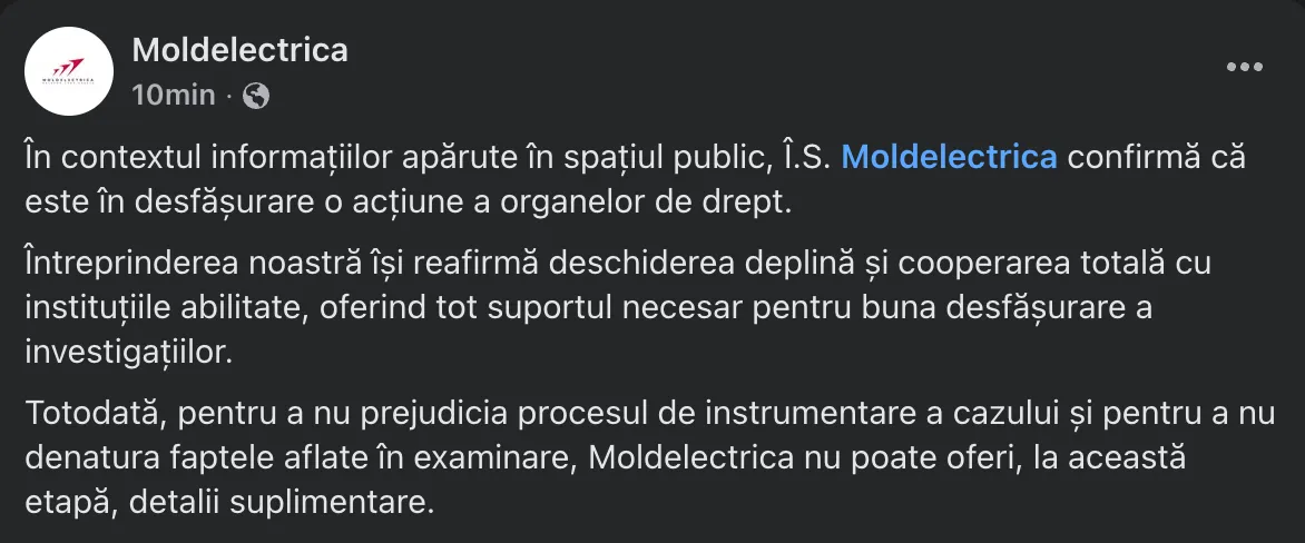 În această dimineață, Î.S. Moldelectrica a confirmat perchezițiile, notând că „întreprinderea își reafirmă deschiderea deplină și cooperarea totală cu instituțiile abilitate, oferind tot suportul necesar pentru buna desfășurare a investigațiilor”.
