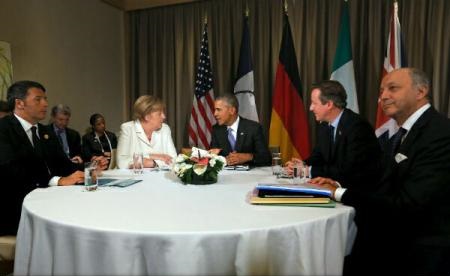 Președintele american, Barack Obama, cancelarul german, Angela Merkel, premierul britanic David Cameron, cel italian, Matteo Renzi, și ministrul francez de externe, Laurent Fabius, care l-a reprezentat la summit pe președintele francez, François Hollande, au avut o scurtă întâlnire aproape de încheierea summitului G20 de la Antalya.