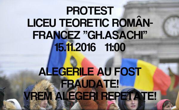 În aceste momente mai mulți tineri s-au adunat în fața liceului Gheorghe Asachi pentru a continua proteste începute ieri. Manifestanții așteaptă un răspuns oficial de la CEC referitor la încălcările care au avut loc duminică în timpul alegerilor prezidențiale. Mai mulți oameni atât din țară, cât și din afară au sesizat încălcări grave în timpul votului. Mai mult ca atât, cetățenii au găsit nereguli și la prezentarea numărului de voturi din localitățile Leușeni, Hâncești și Copceac, Ștefan Vodă, prezentate de CEC. Procesele verbale arătau date diferite decât informația oferită de CEC.