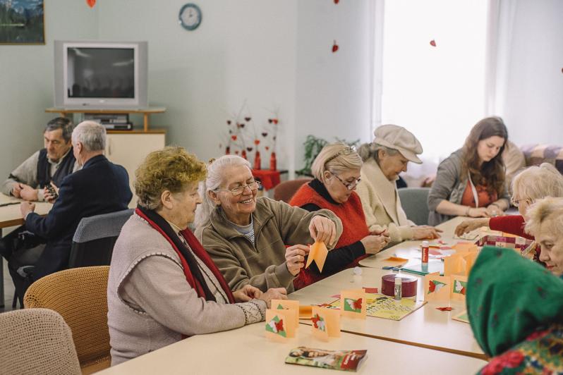 Unul câte unul, vârstnicii ieșeau din cantina socială a instituției. Mulțumiți. Sătui. Bărbații gentili, deschideau ușa doamnelor, iar ele ofereau în schimb un zâmbet sincer. Era ora amiezii. Nimeni nu se grăbea să plece acasă. Fiecare se îndrepta cu pași grăbiți să ocupe un loc în centrul de zi, unde îi așteptau mai multe ocupații. Pereții din interior sunt deghizați în galerii foto cu beneficiari în plin proces de creație. În timp ce în ospătărie ultimii pensionari savurau din bucatele servite, în centrul de zi se auzeau câteva voci ascuțite: