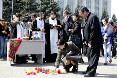 În locul unde, acum un an, a fost omorât Valeriu Boboc, un sobor de preoţi a oficiat o slujbă religioasă, iar lumea a aprins lumânări. Mihai Ghimpu şi-a cerut scuze public, în numele statului, de la Dragoş, feciorul lui Valeriu Boboc, în vârstă de doar trei anişori, pentru moartea tatălui său. În timpul ceremoniei religioase, s-a făcut şi o retrospectivă a evenimentelor din noaptea de 7 spre 8 aprilie 2009.