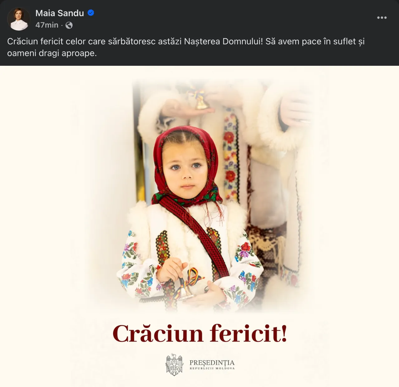 Într-un mesaj pe rețelele sociale, șefa statului a îndemnat cetățenii R. Moldova „să avem pace în suflet și oameni dragi aproape”.