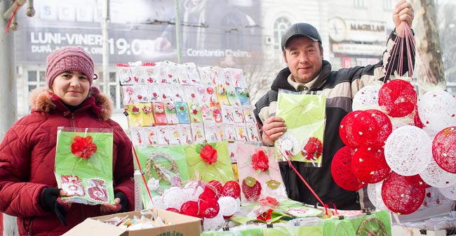 Senină şi cu zâmbetul pe buze, aşa am cunoscut-o pe Elena Bârdan, o femeie iscusită care după luni bune, timp în care a meşterit peste cinci mii de mărţişoare şi, chiar dacă afară erau câteva grade minus şi ningea, a ieşit pe una din străzile capitalei împreună cu soţul pentru a-şi comercializa lucrările. Croşetate sau împletite, din aţă, materie, plastic sau metal, de diferite dimensiuni, toate mărţişoarele sunt opera mâinilor stăpânei casei. Femeia povesteşte că a moştenit dragostea pentru frumos şi pentru croşetat de la bunica ei, iar acum încearcă să-i insufle aceeaşi dragoste fiicei ei de numai zece anişori. „De mică, văzând cu câtă plăcere şi dăruire împletea bunica, am început şi eu să împletesc, apoi să croşetez. Cu timpul însă m-am gândit că ar fi bine să îmbin plăcutul cu utilul şi i-am propus soţului să demarăm o afacere de sezon care să ne asigure un venit suplimentar în bugetul familiei”, îşi aminteşte Elena, o gospodină şi o mamă grijulie care are grijă să nu lipsească nimic în acasă, în timp ce soţul are grijă să asigure confortul financiar al familiei. Constantin, soţul Elenei, spune că din start a fost de acord cu propunerea soţiei, pentru că îşi dorea ca toată lumea să vadă ce lucrări minunate poate face consoarta lui. „Mama ţesea covoare, prosoape şi, cu toate că s-au schimbat vremurile, nu vrem să pierdem tradiţiile moştenite de la părinţi. Nu credeam că o să facem vreun ban din pasiunea asta, dar voiam ca lumea să vadă ce lucrări pot fi făcute cu o simplă croşetă”, îmi spune emoţionat Constantin. El povesteşte că îi place seara după serviciu să vadă ce a mai inventat soţia şi care dintre ideile ei au prins viaţă peste zi.