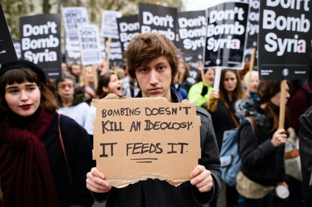 Manifestația are loc după apelul lansat de președintele Francois Hollande deputaților britanici de a aproba participarea țării lor la campania de lovituri aeriene din Siria, la două săptămîni de la atentatele sîngeroase de la Paris revendicate de Statul Islamic.