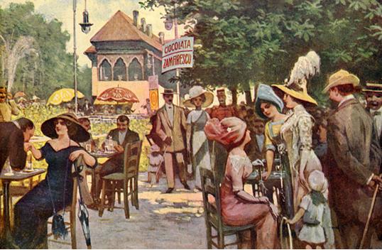 Tinerii şi artiştii bucureşteni erau atraşi mai degrabă de restaurantele de lux de pe Calea Victoriei, unde se semnau contracte de închiriere ori se făceau rezervări cu câteva luni înainte. Printre cele mai frecventate locuri de distracţie erau Cercul Militar, restaurantul Capşa, cafeneaua Kübler, cafeneaua Fialkowski de la intersecţia străzii Ion Câmpineanu cu Calea Victoriei şi cafeneaua High-Life de lângă Athénée Palace. Chiar şi sălile Teatrului Naţional – cel cu sediul pe Calea Victoriei, lângă Palatul Telefoanelor – găzduiau petreceri cu mii de invitaţi, la jeunesse d’or a Bucureştiului:domnişoare cu talia subţire, june modiste şi fetiţe cu gene lungi şi bucle bălaie, negustori cu mustăţile subţiri şi tineri aristocraţi trăgând indiferent din ţigări de foi. Erau vremurile în care gazetele publicau statistici înduioşătoare despre dragostea la vârste tinere:„Un cuplu de îndrăgostiţi se sărută la fiecare 4 minute, femeia întreabă în medie la 10 minute:«Mă iubeşti?» şi are între 3 şi 5 crize de gelozie pe săptămână“.