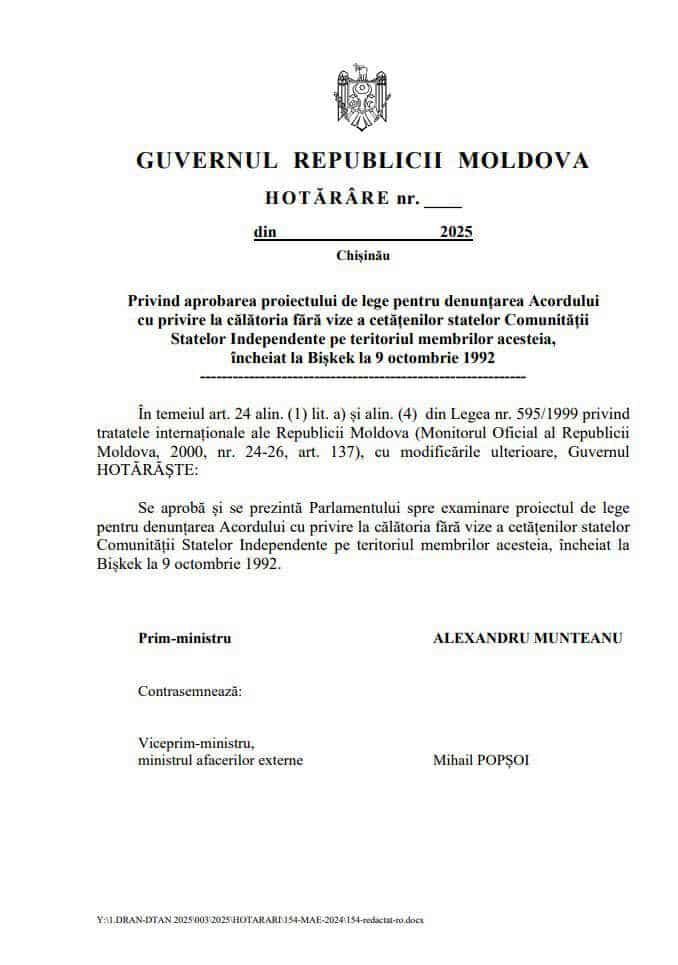 Astfel, se propune denunțarea Acordului cu privire la călătoria fără vize a cetățenilor statelor Comunității Statelor Independente pe teritoriul membrilor acesteia, încheiat la Bișkek la 9 octombrie 1992.