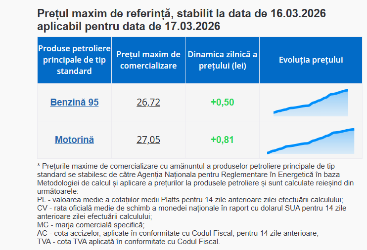 Pentru data de 6 martie, prețul motorinei a fost majorat cu 47 de bani, iar al benzinei cu 16 bani.