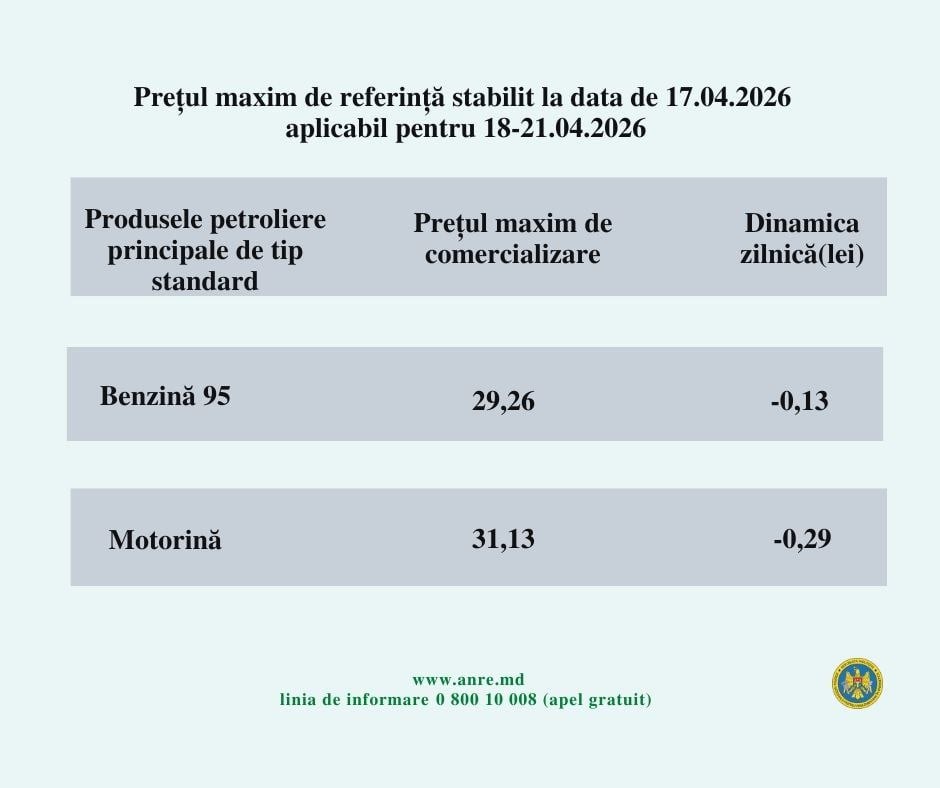 Conform informației prezentate, un litru de benzină va costa 29,26 lei, ceea ce reprezintă o scădere cu 13 bani. Totodată, motorina va costa 31,13 lei/ litru sau cu 29 de bani mai puțin.