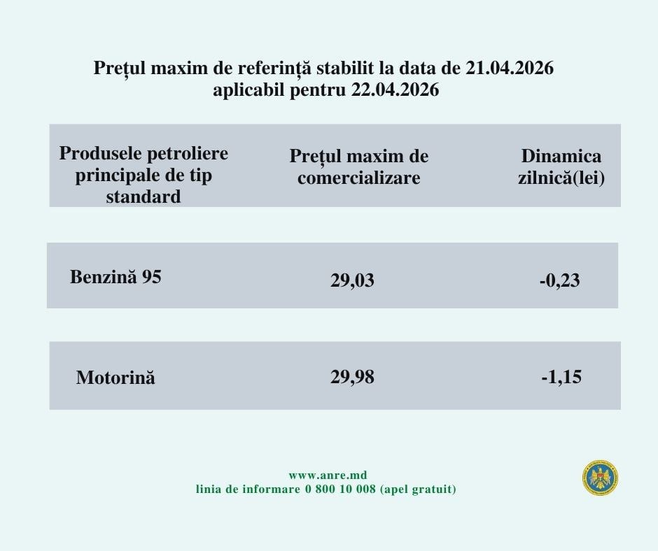 Conform informației prezentate, un litru de benzină va costa 29,03 lei, ceea ce reprezintă o scădere cu 23 bani. Totodată, motorina va costa 29,98 lei/litru sau cu 1,15 lei mai puțin.