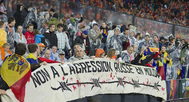 Suporterii moldoveni prezenți în tribune la partida Olanda – Moldova (scor 1-0) au afișat pe parcursul meciului un banner cu inscripția ,,Non a l aggression Russe en Moldavia” (Nu agresiunii rusești în Moldova).