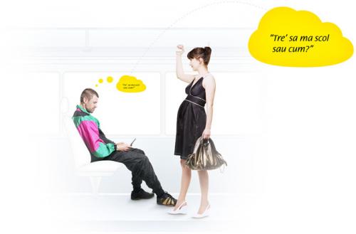Pentru a schimba aceasta situatie, Design.md propune sa lipim pe geamuri nourasii cu „ganduri” ale celui care sta asezat pe scaun si ignora persoanele din jurul sau. „Gandurile” vor fi o serie de cuvinte-sablon, cum ar fi „Cica dorm”, „Tre’ sa ma scol sau cum?”, „Am achitat trei lei ca sa sed aici” etc.