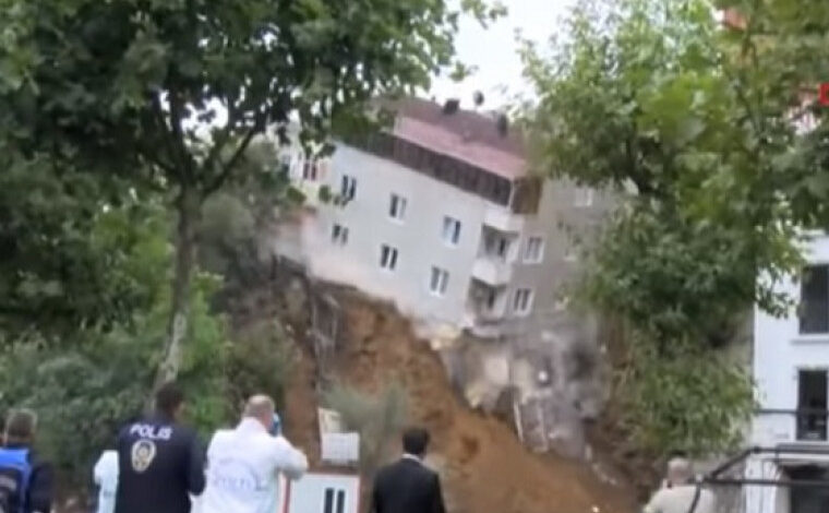 Clădirea, situată în districtul Sutluce din cartierul Beyoglu, a rămas suspendată in urma averselor căzute pe timpul nopţii care au pătruns în fundaţie.