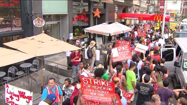 În șapte orașe americane, angajații rețelelor de localuri specializate mâncarea fast-food au ieșit concomitent în stradă. Oamenii cer majorarea salariilor de la șapte dolari până la 15 dolari pe oră, pentru că sunt nevoiți să lucreze în mai multe locuri pentru a-și achita facturile și chiria locuinței. Protestatarii au venit la proteste cu familii întregi, iar unii politicieni americani au ieșit în apărarea drepturilor angajaților cu venituri mici. Potrivit unor experți, pentru ca o familie din patru persoane să trăiască decent în New-York, salariul unui angajat trebuie să constituie cel puțin 11 dolari pe oră.