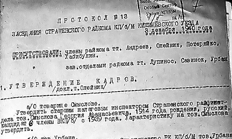 Primul registru centralizat al cadrelor raionale de conducere sovietică la Strășeni a fost alcătuit peste vreo două luni după instaurarea noii puteri. Îl el erau înscrise pe scurt datele biografice ale fiecăruia, inclusiv nivelul de studii pe care îl aveau, localitatea de unde au sosit și vechimea în partid.