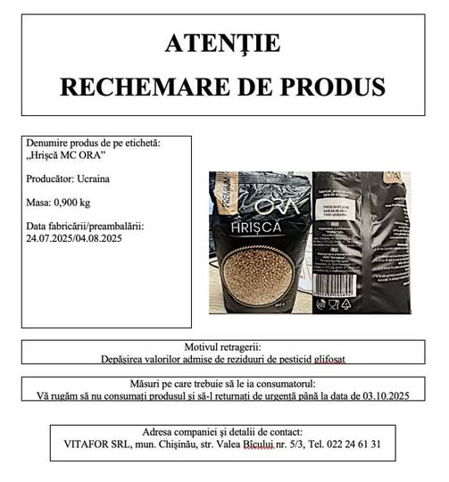 Compania responsabilă, „VITAFOR” S.R.L., este investigată pentru încălcarea gravă a standardelor de siguranță alimentară. Specialiștii în toxicologie avertizează că ingestia produsului poate provoca efecte severe asupra sănătății, de la tulburări digestive și alergii până la riscuri pe termen lung asupra sistemului hormonal și chiar creșterea riscului de cancer. Autoritățile fac apel la populație să nu consume hrișca „ORA” și să o returneze în magazine sau să o predea punctelor de colectare desemnate.