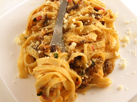 Pastele se pun la fiert, apoi se strecoara si se clatesc cu apa rece. Separat, se curata vinetele se taie felii subtiri si se lasa cu sare 30 min. Vinetele se scurg si se taie cubulete, apoi impreuna cu ceapa se calesc bine. Se adauga usturoiul taiat marunt, rosia curatata de pielita si taiata cubulete, sarea si piperul. Intr-o forma pentru sufleu se aseaza alternativ un strat de paste cu unul din sosul de vinete. Deasupra, se adauga cascavalul ras sau parmezanul si smintina cu patrunjelul taiat marunt si amestecat cu ou. Se lasa la cuptor 30 min. Se serveste calda in compania unui vin roze…