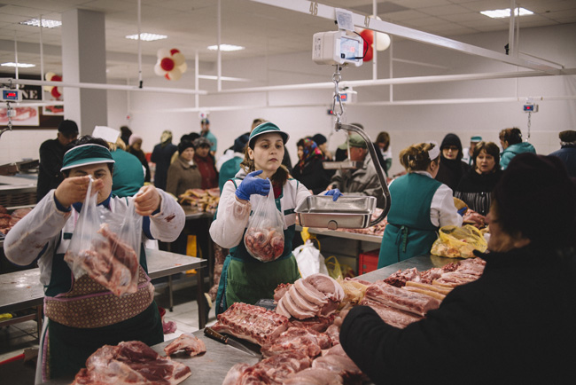 La rândul lor, lucrătorii din secția de vânzare a cărnii recunosc că acordă o atenție sporită comunicării cu clienții. Iurie comercializează carne de la sfârșitul anilor ‘90. Bărbatul recunoaște că în halele vechi, în care a activat anterior, era o mizerie totală, iar colegii săi deseori încercau să înșele cumpărătorii la cântar. „Acum am trecut la un alt nivel. E mult mai bine, mai modern și mai curat. Oamenii vin cu tragere de inimă, iar numărul lor s-a mărit de câteva ori. Pentru noi e o plăcere să lucrăm în asemenea condiții”, a recunoscut mulțumit vânzătorul, în timp ce mărunțea câteva bucăți de ceafă de porc. La final, el a arătat că are mereu la îndemână mănușile de unică folosință.