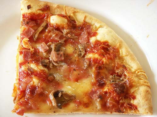 Pentru inceput va apucati sa faceti aluatul. Drojdia o veti pune la dospit in putin lapte si zahar (in mijlocul fainii). Cand a dospit (adica dupa 4,5 minute) se incorporeaza in faina si se adauga laptele si uleiul.Se va framanta bine si se va lasa la dospit aproximativ 30 minute. Pana dospeste aluatul taiati sunca si ciupercile cubulet, rosiile si ardeiul felii. Bulionul de rosii se amesteca cu putina apa, busuioc, cimbru si pier dupa gust. Dupa ce aluatul a crescut se intinde pe o tava unsa cu margarina, se toarna peste aluat jumatate din bulionul amestecat cu condimente, apoi incep sa se aranjeze cubuletele de sunca, ciupercile, feliile de rosii si ardeiul, se toarna ouale batute, apoi restul de bulion, iar la sfarsit se presara cu cacaval sau parmezan. Se introduce tava la cuptorul incins in prealabil si se lasa la copt aproximativ 30 de minute. Se serveste atat fierbinte cat si rece…alaturi de o bere care musai trebuie sa fie rece 🙂