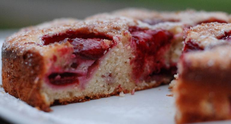 Încălziţi cuptorul la foc mediu spre mare. Ungeţi o tavă dreptunghiulară (nu prea mare) cu unt şi pudraţi-o apoi cu făină. Puneţi feliile de prune într-un castron şi amestecaţi-le cu două linguri de făină. Într-un alt castron amestecaţi făina cu sarea şi bicarbonatul. Separat amestecaţi untul, zahărul, alcoolul şi zahărul vanilat. Adăugaţi apoi oul şi amestecaţi bine până când totul este incorporat. Puneţi treptat laptele amestecând bine şi la sfârşit adăugaţi amestecul de făină câte puţin ca să nu se facă cocoloaşe. Turnaţi amestecul în tavă netezind cât mai uniform. Aşezaţi prunele pe deasupra aluatului şi coaceţi 35-40 de minute. Se lasă să se răcească înainte de a o tăia. Se serveşte pudrată cu zahăr.