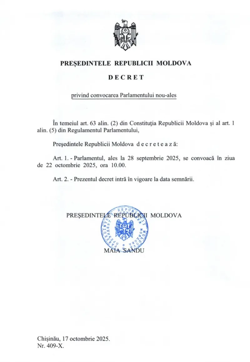 Conform documentului prezidențial, prima ședință a noului Legislativ va avea loc miercuri, 22 octombrie, începând cu ora 10:00. În cadrul acesteia, deputații urmează să aleagă organele de conducere și de lucru ale Parlamentului, inclusiv președintele Legislativului, vicepreședinții, Biroul permanent și comisiile de specialitate.
