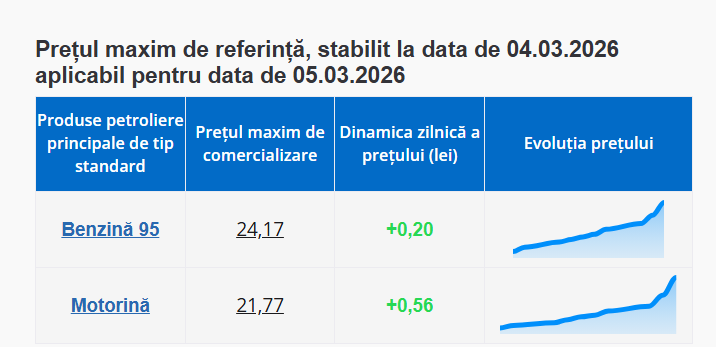 Prin urmare, pe data de 5 martie, un litrul de benzină va costa 24,17 lei, iar unul de motorină – 21,77 lei.