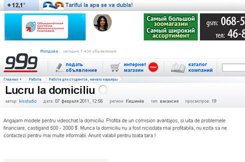 Am discutat cu o persoană, Igor, care racolează fete prin intermediul unuia dintre cele mai mari panouri de anunţuri online. Igor spune că, dacă fata este cu adevărat interesată de o carieră de model webcam, el îi poate oferi „pe parcurs” un contract şi o carte de muncă. Doar că, la moment, agenţia sa „nu plăteşte impozite”…