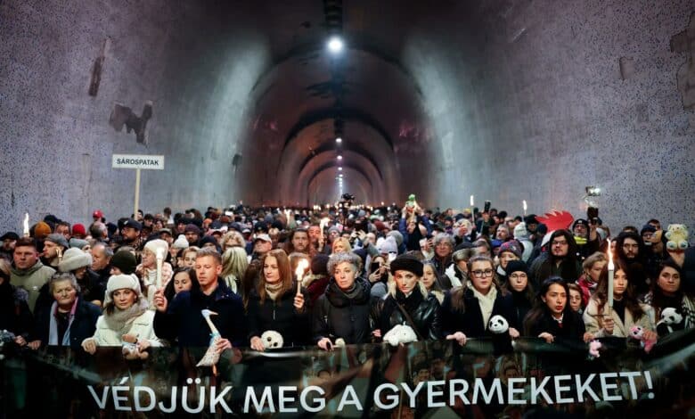 Magyar a condus mulțimea, ținând un banner pe care scria „Să protejăm copiii”.