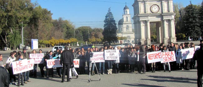 „Nu reforme fără sens!”, „Ocrotiţi Academia!” – aşa au scandat ieri în faţa Guvernului un grup de studenţi de la Academia de Muzică, Teatru şi Arte Plastice (AMTAP). Cei câteva zeci de protestatari s-au arătat nemulţumiţi de aşa-numitele reforme propuse de Colegiul Ministerului Culturii (MC). Mai mult, studenţii sunt speriaţi şi de faptul că ar putea fi evacuaţi din blocul de pe strada 31 August 1989, nr. 137, şi transferaţi la Colegiul „Alexandru Plămădeală”. Ei cer ministerului să înceteze orice acţiuni de acest fel.