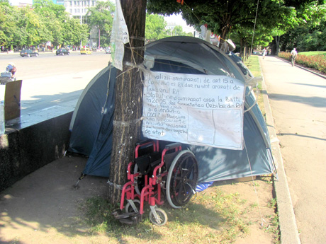 Tudor Pânzari protestează de pe 12 iulie 2010. Şi-a instalat cortul în Piaţa Marii Adunări Naţionale şi stă acolo 24 din 24 de ore. „Am început la Ambasada Statelor Unite ale Americii, iar pe 29 septembrie am venit în faţa Guvernului. Acum sunt singur, dar iarna a stat şi soţia aici, pentru că-s bolnav şi avea grijă de mine”, îmi spune el. „Mi s-au încălcat drepturile constituţionale de cetăţean al R. Moldova: acum zece ani mi-au demolat apartamentul şi până azi nu mi-au dat altul în locul celui demolat, dar nici pentru că sunt invalid în urma războiului de pe Nistru. Am şi un titlu executoriu din 2005, dar nu-i luat în considerare: Ministerul Apărării trebuie să-mi facă expertiza ca să am o pensie de vreo 1000 de lei, pentru că azi primesc doar 309 lei”, spune el. Familia sa a rămas pe drumuri la Căuşeni. „De zece ani trăim doar prin gazde. Cred că statul se răzbună pentru faptul că am luptat în războiul din 1992. Voi sta în cortul din faţa Guvernului până îmi vor fi soluţionate toate problemele”.