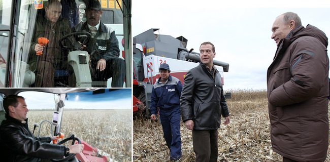 Putin şi Medvedev s-au întâlnit pe aeroport, unde s-au salutat de parcă nu s-ar mai fi văzut de ani de zile. A urmat vizita de lucru la o fermă, cu momentul de vârf: fiecare din cei doi s-a căţărat într-o o combină şi, ajutat de un om de meserie, a condus-o prin lanul de porumb.