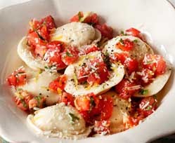 Se toaca rosiile si busuioc-ul, se rade lamaia si apoi se amesteca toate impreuna cu ulei-ul de masline, sare si piper apoi se lasa să stea la temperatura camerei cel puţin 15 minute pentru a se amesteca aromele. Intre timp se fierb ravioli conform instructiunilor de pe pachet. Cand s-au fiert se toarna peste amestecul cu rosii. Inainte de a le servi le veti presara cu parmesan ras.