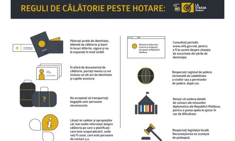 Totodată, pentru siguranța proprie, persoanele care planifică o călătorie în scop turistic, spun specialiştii, ar trebui să îşi noteze adresele misiunilor diplomatice ale Republicii Moldova în țara de destinație, dar şi să se informeze despre situaţia de securitate zona pe care o vor vizita. Acest lucru poate fi făcut accesând pagina web a Ministerului Afacerilor Externe și Integrării Europene al Republicii Moldova.
