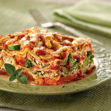 Într-un vas de aproximativ 30×20 cm, stropiţi/ungeţi pereţii vasului cu ulei vegetal, turnaţi un strat de sos de roşii (200 g), acoperiţi cu 4 foi de lasagna. Adăugaţi un strat de legume, iar deasupra – jumătate din măsline, jumătate din sosul de frişcă şi 200 g de mozzarela. Repetaţi încă o dată toate straturile. Acoperiţi cu ultimele 4 foi de lasagna, 200 g de sos de roşii şi 200 g de mozzarela. Ungeţi cu ulei vegetal o folie de aluminiu şi acoperiţi lasagna. Lăsaţi să se coacă până la fierbere (aproximativ 35 minute). Răciţi timp de 25 minute, condimentaţi cu busuioc şi serviţi.