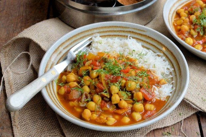Se încinge uleiul într-o tigaie adâncă. Se aruncă seminţele de chimion, turmericul şi celelalte condimente; se lasă 30 de secunde. Se adaugă ceapă tocată mărunt şi se mai lasă 1 minut să se înmoaie. Se adaugă usturoiul şi ghimbirul ras şi se lasă încă 1 minut. Se amestecă roşiile tocate, pasta de tomate, ardeiul iute murat şi fulgii de ardei iute, zahărul, sarea şi apă; se lasă să fiarbă 10 minute. Se adaugă năutul şi se mai ţine pe foc încă 5 minute. Între timp, puneţi la fiert 1 cană de orez basmati cu 2 căni de apă şi 1/2 de linguriţă de sare. Se serveşte mâncarea alături de orez.