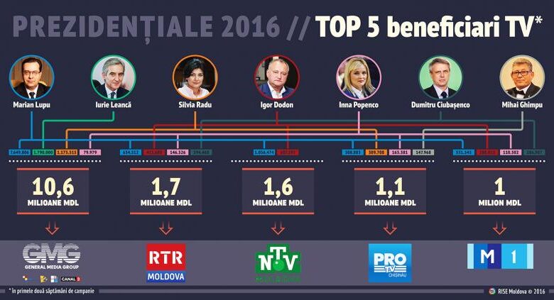 Marian Lupu, Silvia Radu, Inna Popenco și Iurie Leancă sunt cei patru candidați la fotoliul de președinte al Republicii Moldova, care, împreună, au virat în conturile trustului General Media Group Corp., aproape 11 milioane de lei. Trustul este controlat de viceprim-președintele PDM Vladimir Plahotniuc și deține Prime TV, Publika TV, Canal 2 și Canal 3. Banii au ajuns în trustul lui Plahotniuc în doar două săptămâni, potrivit primelor rapoarte financiare depuse de candidați la Comisia Electorală Centrală.