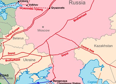 Detaliu cu amplasarea conductelor de gaz controlate de Gazprom în regiune.