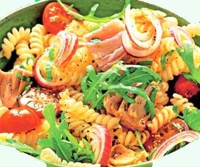Fierbeti pastele in apa cu sare conform instructiunilor de pe pachet, puneti-le intr-o strecuratoare, turnati apa rece peste ele si scurgeti-le. Curatati ceapa si taiati-o inele fine. Spalati rosiile si taiati-le in jumatate. Puneti atat ceapa, cat si rosiile intr-un castron impreuna cu pastele si amestecati-le. Pentru dressing amestecati sucul de lamaie, supa, sarea, piperul si uleiul de masline. Turnati-l peste salata, amestecati inca o data ingredientele si lasati-o la frigider aproximativ 30 de minute sa se patrunda. Spalati rucola si rozmarin-ul, taiati rucola in doua si tocati rozmarin-ul. Scurgeti tonul si despartiti-l bucatele. Amestecati-l in salata impreuna cu rucola sirozmarin-ul tocat si condimentati totul inca o data cu sare si piper.