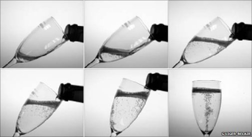 Revista Journal of Agriculture and Food Chemistry a publicat un studiu al cercetătorilor francezi care au analizat emisiile de dioxid de carbon în momentul turnării şampaniei în pahar pe două căi: în mod tradioţional, vertical, şi în felul cum se toarnă berea, ţinând paharul sub un unghi. Ei au constatat că băutura turnată încet, prelingându-se pe pereţii recipientului elimină mai puţine bule de gaz şi păstrează mai mult timp calităţile gustative, decât dacă ar fi turnată în mod tradiţional. De asemenea, servirea rece a şampaniei contribuie la menţinerea cantităţii optime a bulelor de dioxid de carbon atât de preţioase pentru orice tip de vin spumos.