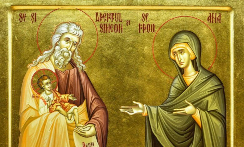 Pentru necredinta sa, Dumnezeu i-a fagaduit ca nu o sa moara pana nu va vedea pe Mesia nascut din Fecioara (Luca 2, 25-26). La 40 de zile de la nasterea lui Hristos, se implineste fagaduinta facuta de Dumnezeu, caci Sfantul si Dreptul Simeon, indemnat de Duhul Sfant, va lua in brate pe Cel nascut din Fecioara si va spune: "Acum slobozeste pe robul Tau, Stapane, dupa cuvantul Tau, in pace, ca vazura ochii mei mantuirea Ta". "Acum slobozeste" inseamna acum am inteles ca s-a implinit ceea ce s-a fagaduit. Aceasta rugaciune "Acum slobozeste", este rostita de noi, la fiecare slujba a Vecerniei, adica la inceputul unei zile liturgice.