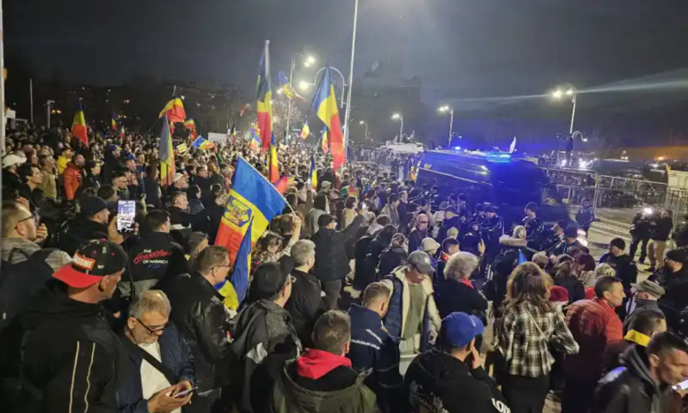 Mulțimea strigă „Ultima soluție – înc-o revoluție!”, „CCR – o mizerie!”, „Georgescu – Președinte!”, „Jos Dictatura”, „Hoții!”, „Jos Guvernul Mondial!”.