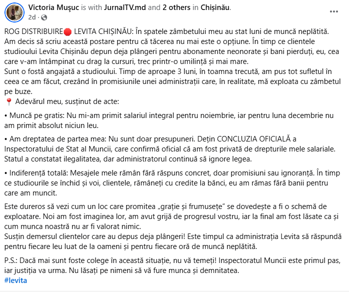 Am decis să scriu această postare pentru că tăcerea nu mai este o opțiune. În timp ce clientele studioului Levita Chișinău depun deja plângeri pentru abonamente neonorate și bani pierduți, eu, cea care v-am întâmpinat cu drag la cursuri, trec printr-o umilință și mai mare.