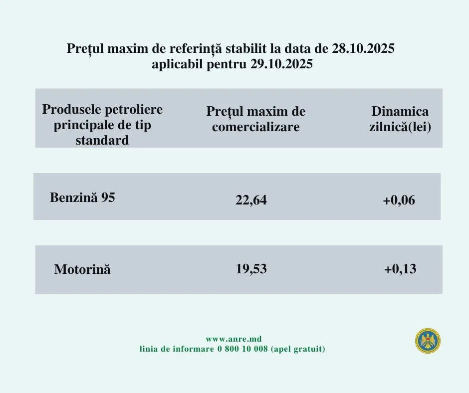 Agenția Națională pentru Reglementare în Energetică (ANRE) a stabilit prețurile maxime de referință pentru produsele petroliere principale de tip standard pentru mâine, 29 octombrie.