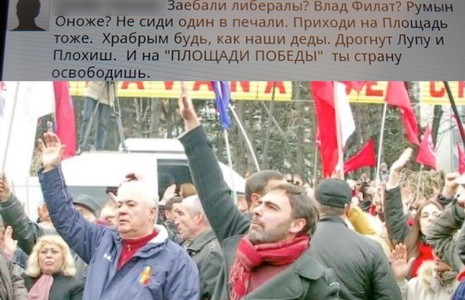 Traducere aproximativă din limba rusă: Îți stau în gât liberali? Vlad Filat? Românul Onoje? Nu sta singur și întristat. Vino în Piață. Fii curajos, precum bunicii noștri. Să-i cutremurăm pe Lupu și Plahotniuc. Iar pe "PIAȚA VICTORIE" țara tu o vei elibera.