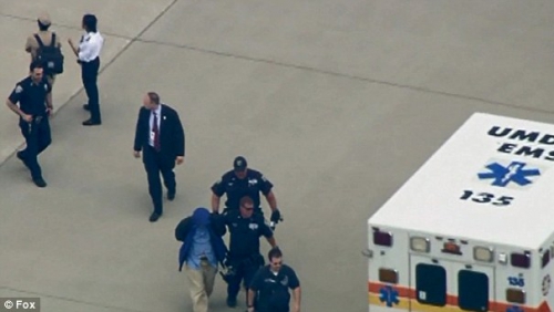 A început apoi să strige, pomenind Agenţia pentru Securitate Naţională (NSA) şi CIA. A încercat să ducă mâna la buzunare, lumea s-a speriat, unii dintre pasageri au încercat să îl imobilizeze, l-au pus la pământ, iar membrii echipajului au reuşit să îi pună cătuşele şi să îl imobilizeze pe un scaun, altul decât cel pe care stătuse.