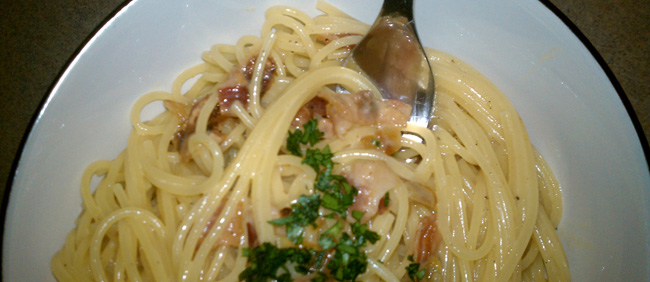 Tăiaţi baconul cuburi mici, apoi tăiaţi felii subţiri şi ciupercile. Tocaţi pătrunjelul verde, pregătiţi smântâna, radeţi brânza parmezan, şi astfel aveţi toate ingredientele la îndemână. Puneţi într-o tigaie o lingură de ulei de măsline. Adăugaţi baconul, ciupercile şi rumeniţi-le împreună până când devin maro-aurii. Stingeţi focul şi lăsaţi-le deoparte pe aragaz. Într-o oală puneţi doi litri de apă, o lingură de sare, o lingură de ulei de măsline şi lăsaţi-o la foc mare până începe să fiarbă. Când a început să fiarbă, adăugaţi pastele, micşoraţi focul şi lăsaţi-le să fiarbă conform indicaţiilor de pe ambalaj, amestecând uşor ca să nu se lipească. După ce au fiert pastele, scoateţi-le la scurs într-o strecurătoare. Cât se scurg pastele, puneţi gălbenuşurile într-un bol şi adăugaţi smântâna. Amestecaţi bine până se omogenizează. Adăugaţi apoi şi parmezanul ras şi amestecaţi din nou. Când toate ingredientele s-au integrat uniform în compoziţie, sosul este gata. Turnaţi pastele în tigaie peste bacon şi ciuperci şi amestecaţi bine. Adăugaţi şi sosul peste paste, amestecaţi până se încorporează sosul printre toate ingredientele din tigaie, condimentaţi cu sare şi piper după gust şi amestecaţi din nou. În final, adăugaţi pătrunjelul tocat şi pastele vor fi gata pentru a fi servite.