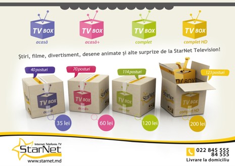 Divertisment 100% cu noile grile TV de la StarNet Television. Locuitorii din Chişinău, Ungheni, Soroca, Edineţ, Sângerei, Cahul, Hânceşti şi din celelalte oraşe, în care StarNet are deschise puncte de vânzări, se pot bucura acum de noile pachete de televiziune „TVBOX”: Acasă (40 de canale), Acasă Plus (70 de canale), Complet (114 canale) şi Complet HD (123 de canale, dintre care 13 sunt HD).