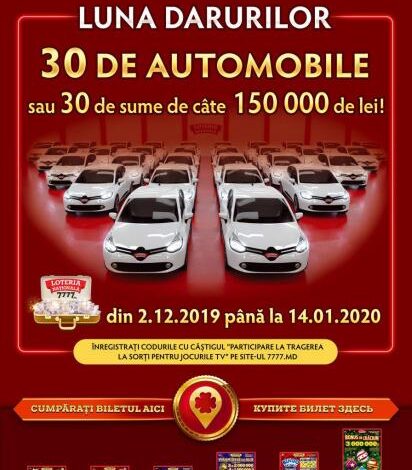 Pentru a participa la campania ”Luna Darurilor”, biletele de loterie trebuie să fie înregistrate pe 7777.md sau la numărul de telefon 022 333 777 ca să găsiți ”participare la tragerea la sorți pentru jocurile TV”. Anume acest câștig oferă dreptul să participați la extragerea, de luni și până vineri, a unui automobil nou pe zi sau a unei sume de 150 de mii de lei!